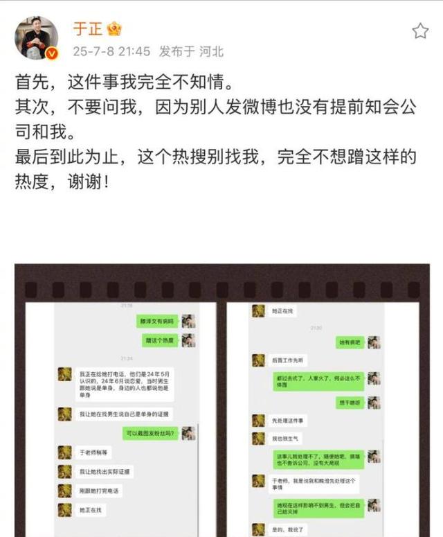 于正表示,“完全不知情,准备劝退滕泽文”,虽然死丫头于正嘴上在指责滕泽文,但是只要是看过截图的都能感觉出来,实际上于正在暗戳戳的锤田栩宁。